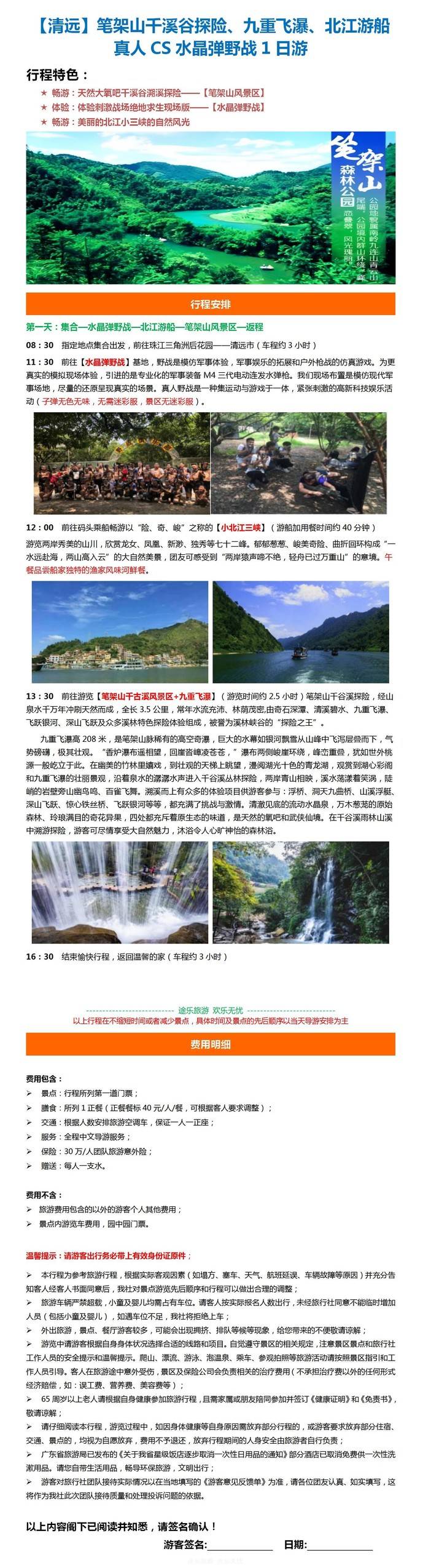 【清远】笔架山千溪谷探险、九重飞瀑、北江游船、真人CS水晶弹野战1日游