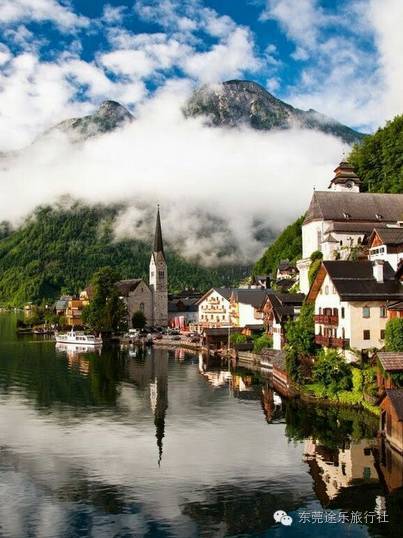 ►进入奥地利小镇,以教堂和天空为背景,在美丽铁桥上拍个照