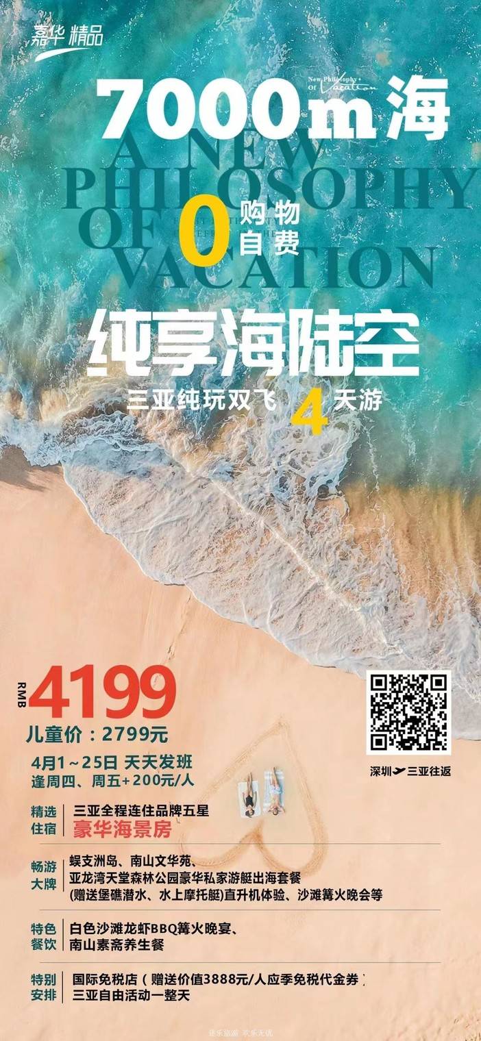 【4月海南】分界洲岛/亚龙湾天堂公园/槟榔谷景区/娱支洲岛/经典天涯海角/南山文华苑/亚龙湾沙滩篝火晚会 [复制链接]
