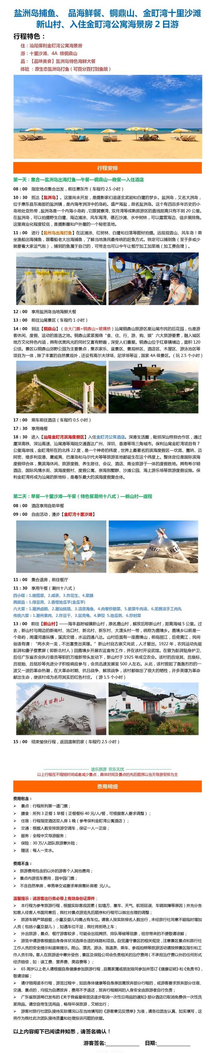 【惠东】盐洲岛捕鱼、 品海鲜餐、铜鼎山、金町湾十里 沙滩、新山村、入住金町湾公寓海景房2日游