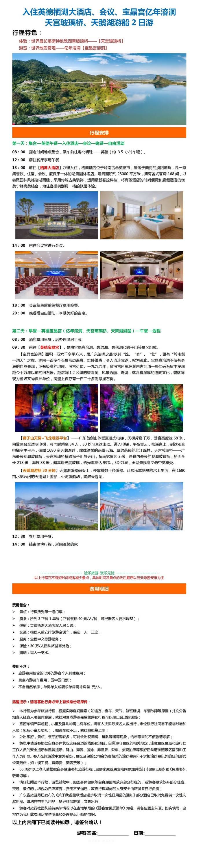【英德】入住英德栖湖大酒店、会议、宝晶宫亿年溶洞、天宫玻璃桥、天鹅湖游船2日游