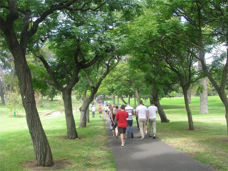 9点到达阿德莱德。澳大利亚的海关检查是非常严格的,特别是禁止带入各种食品。如果未经申报带入牛肉干之类食品,轻则当场扔掉,重则罚款。如果是处方药品还要医生的处方证明。因此我什么吃的东西和常用药品都没有带,填写入境单时,在所有携带物品的选项中全部选no,免得被入境官盘问。果然,入境时我很顺利,没有被盘问。但是有一个队友在入境单上填写带了药品,被盘问了很久。领取行李后,排队出海关,我们先后被海关盘问4次,官员在我们的入境单上划了一些记号,将我们几个的入境单让我一个人拿着,把我们的行李摆放在地上,然后让一条小狗在行李上反复嗅闻。当时心情有些紧张,生怕小狗嗅觉发生错觉,召惹麻烦事情。