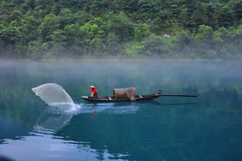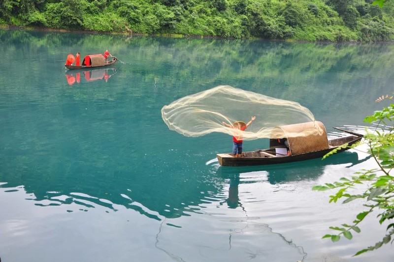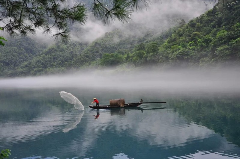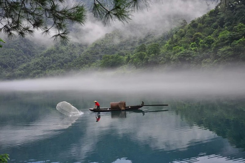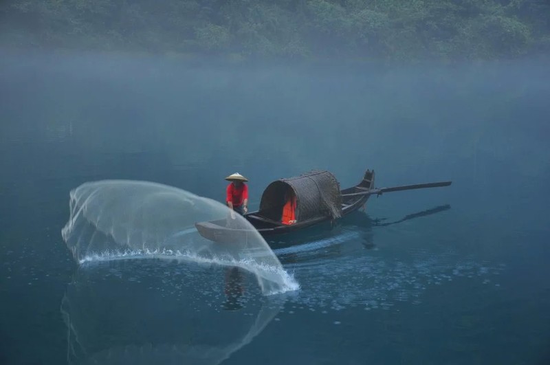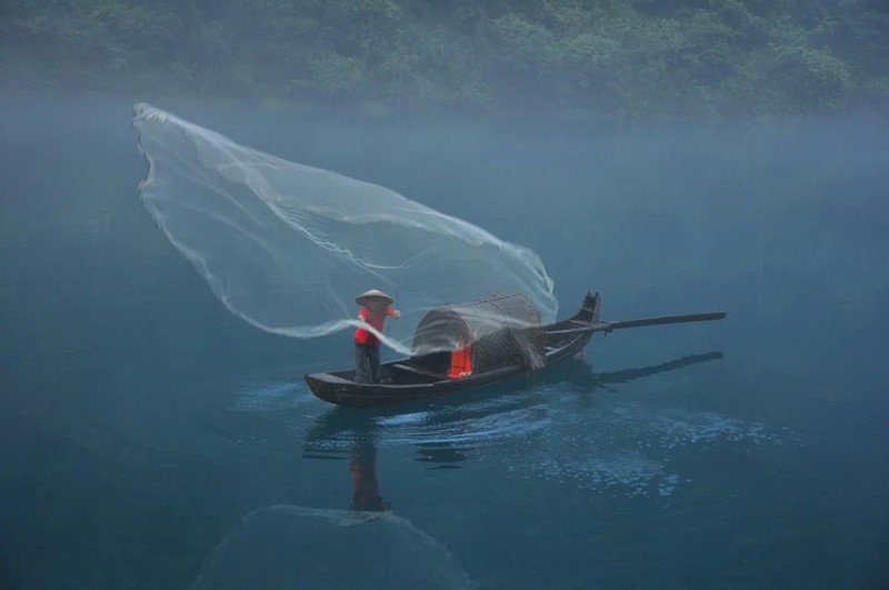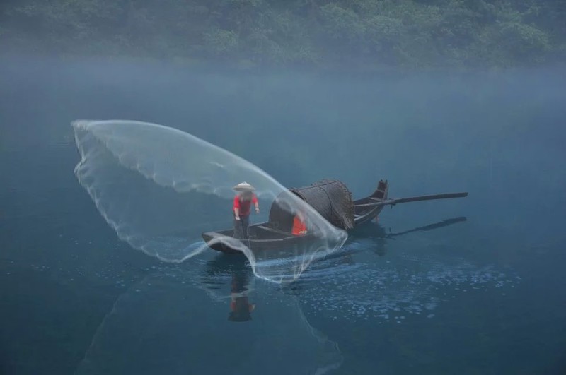 到的时候约7点,江上雾气已散去不少。二号桥处,长枪短炮蹲守。几艘小渔船抛网做秀。一撒,咔嚓声就机关枪似的,让人觉得危机四起,心惊胆战。撒的一手好网,打不上一条小鱼,沿途栈道不错,山上电线塔有碍观瞻。