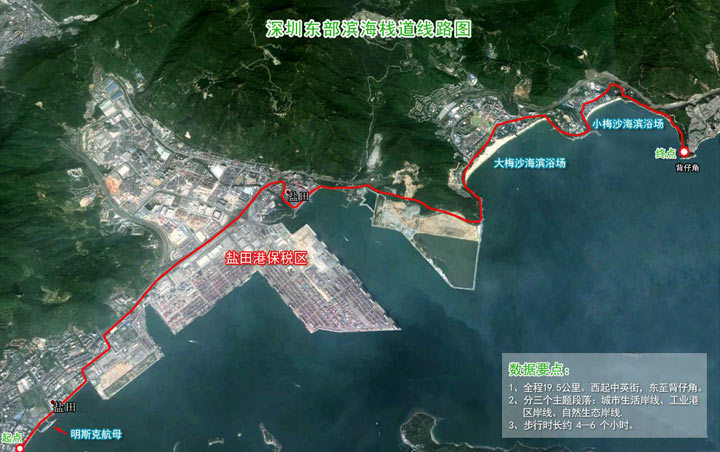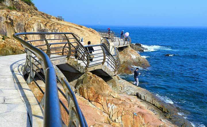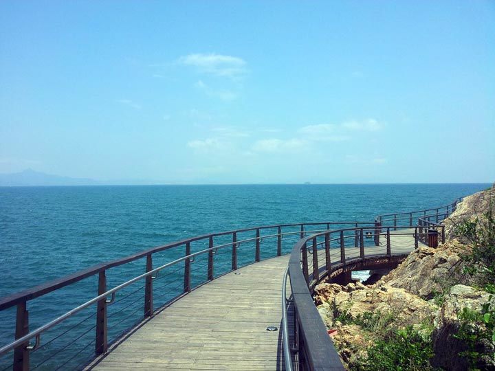 东部海滨栈道目前建成部分,起点在中英街,终点在揹仔角,全程除了少数下到海边和上公路的台阶之外,几乎都是很平坦的海滨栈道,全程轻松步行大约6、7个小时,可以说是老少咸宜的徒步线路。