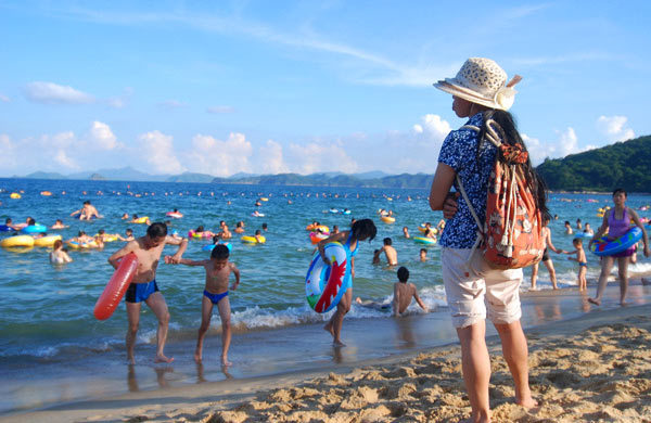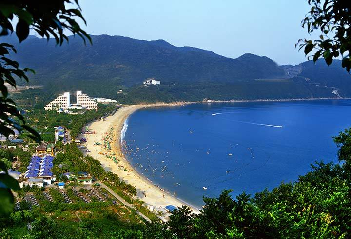 新月形海滩,水清沙白,水质较大梅沙略胜一筹,来玩沙戏水是个不错的选择~
